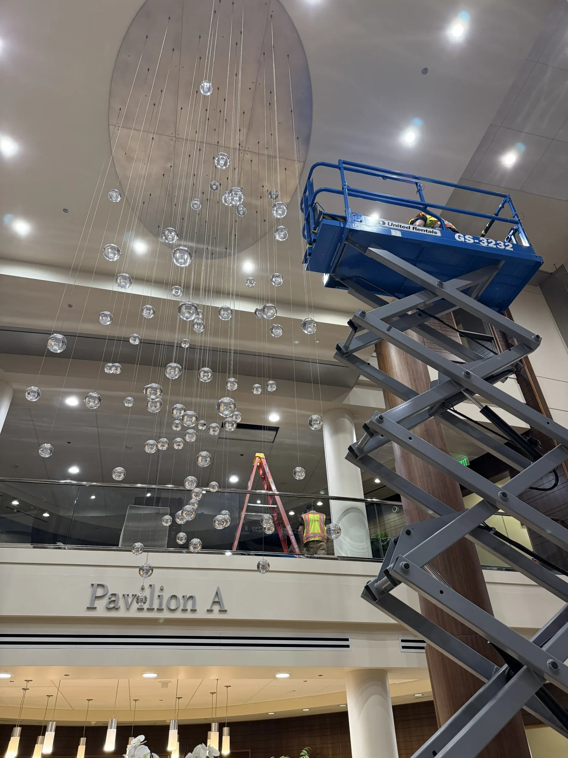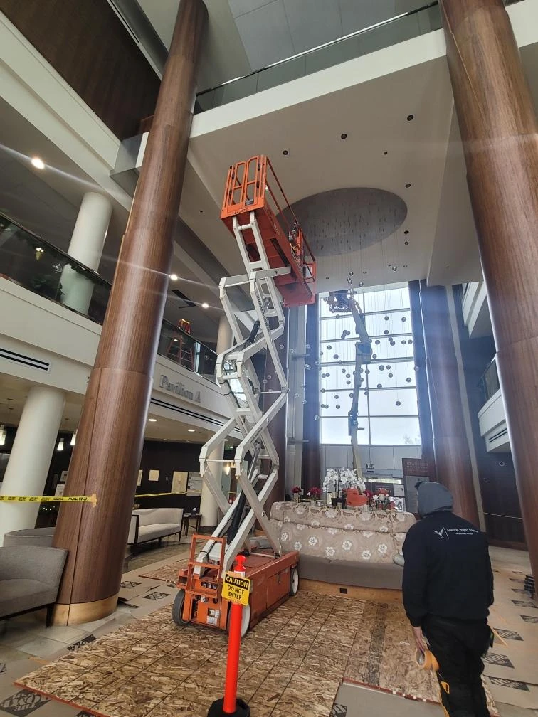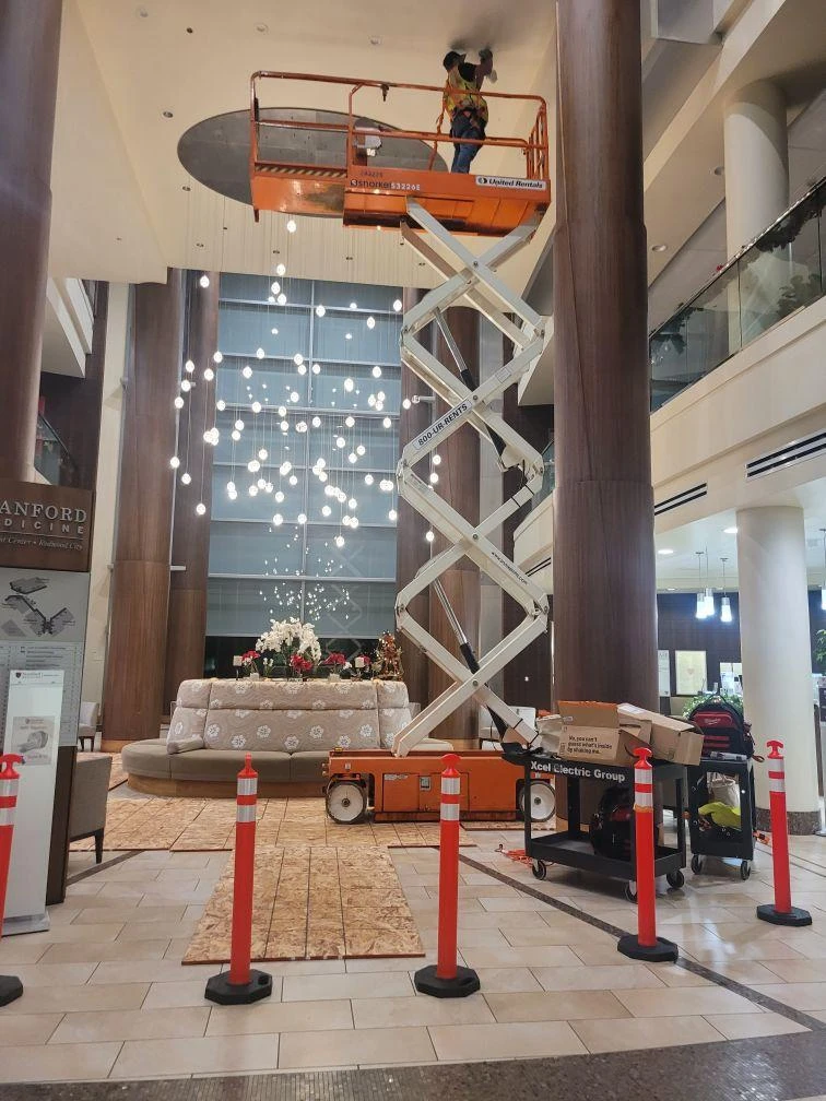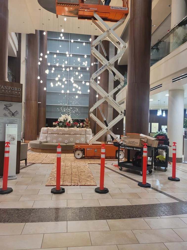APS successfully completed a complex LED retrofit of a 200-fixture chandelier installed approximately 30 feet above finished floor level within an active healthcare environment. Prior to installation, APS conducted a detailed lighting study to evaluate and specify LED fixtures and materials that would deliver improved illumination levels while increasing energy efficiency, reducing heat output, and extending operational lifespan to minimize long-term maintenance.